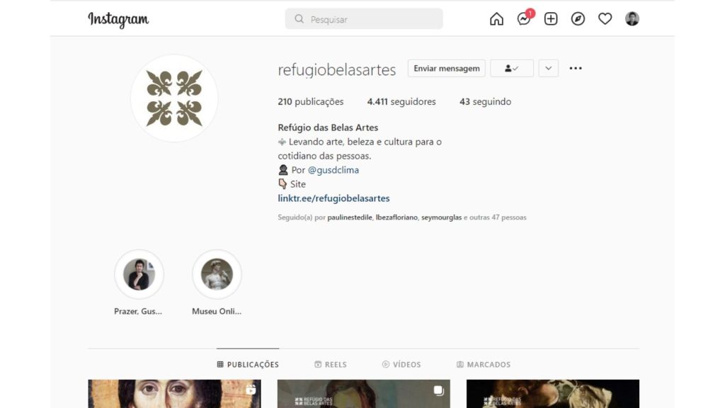 O Refúgio das Belas artes é um dos mais completos portais sobre arte clássica do Brasil. No Instagram, postagens semanais sobre história da arte, curiosidades do meio e interações intensas com os seguidores. No site, um museu online com mais de 350 obras de arte em alta definição (desde o Egito antigo até os Impressionistas) e um blog com textos mais longos e trabalhados que se propõem a dar uma nova perspectiva sobre a cultura no nosso país.