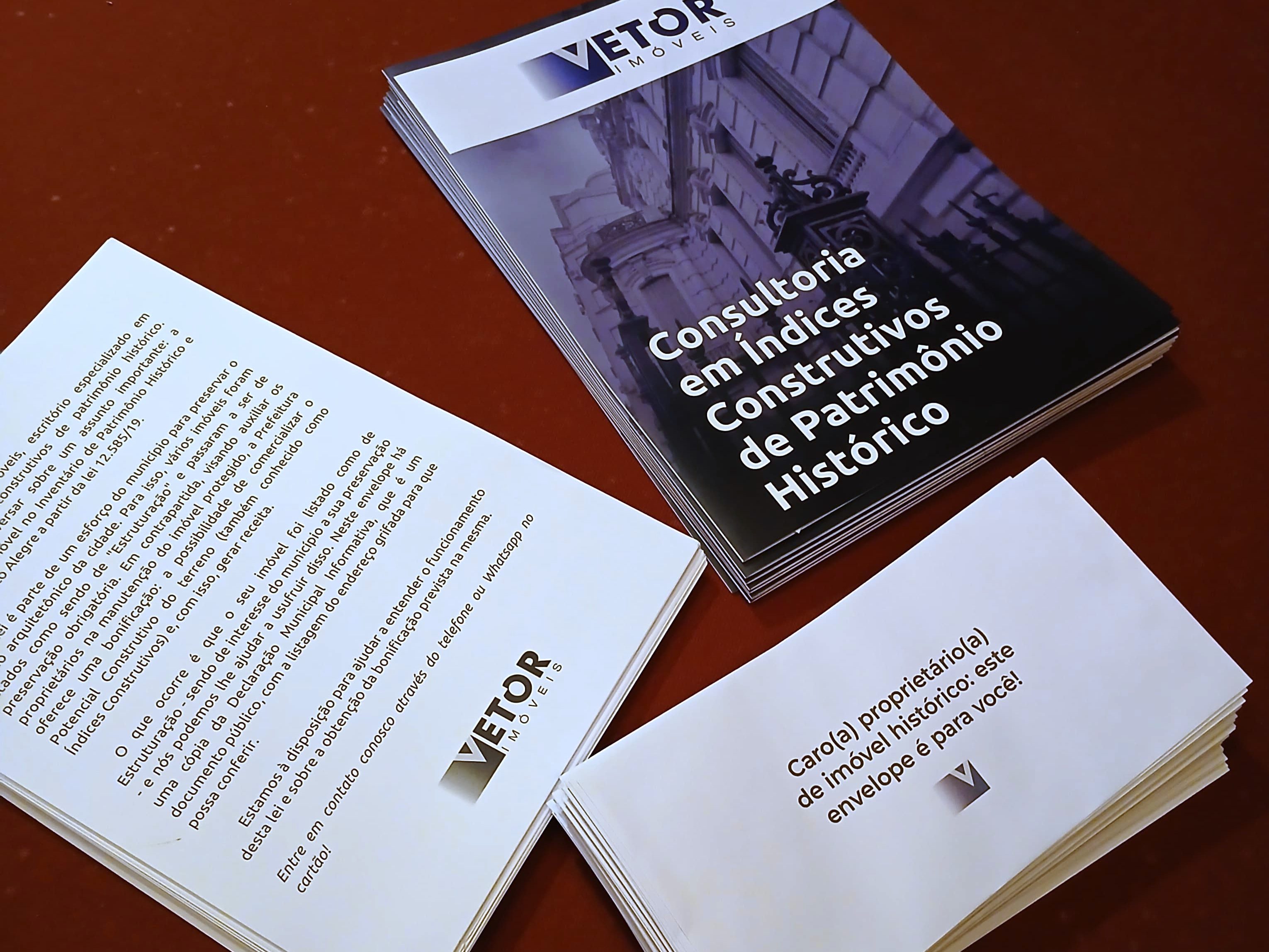 Desde os anos 90, a Vetor Imóveis atua no mercado imobiliário e de construção civil de Porto Alegre, mais especificamente com a intermediação de índices construtivos e terrenos. Já sendo uma empresa referência no mercado da cidade, viu-se diante de uma nova oportunidade: o nascente mercado de índices de patrimônio histórico surgido após a promulgação de uma lei municipal que bonifica os proprietários destes imóveis com a possiblidade de comercializar o potencial construtivo do seu terreno para gerar receita para restauros e manutenções.